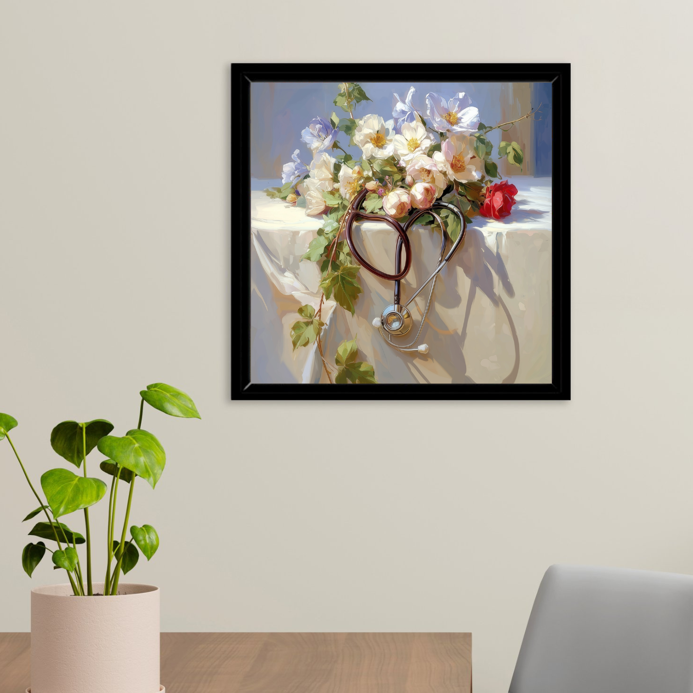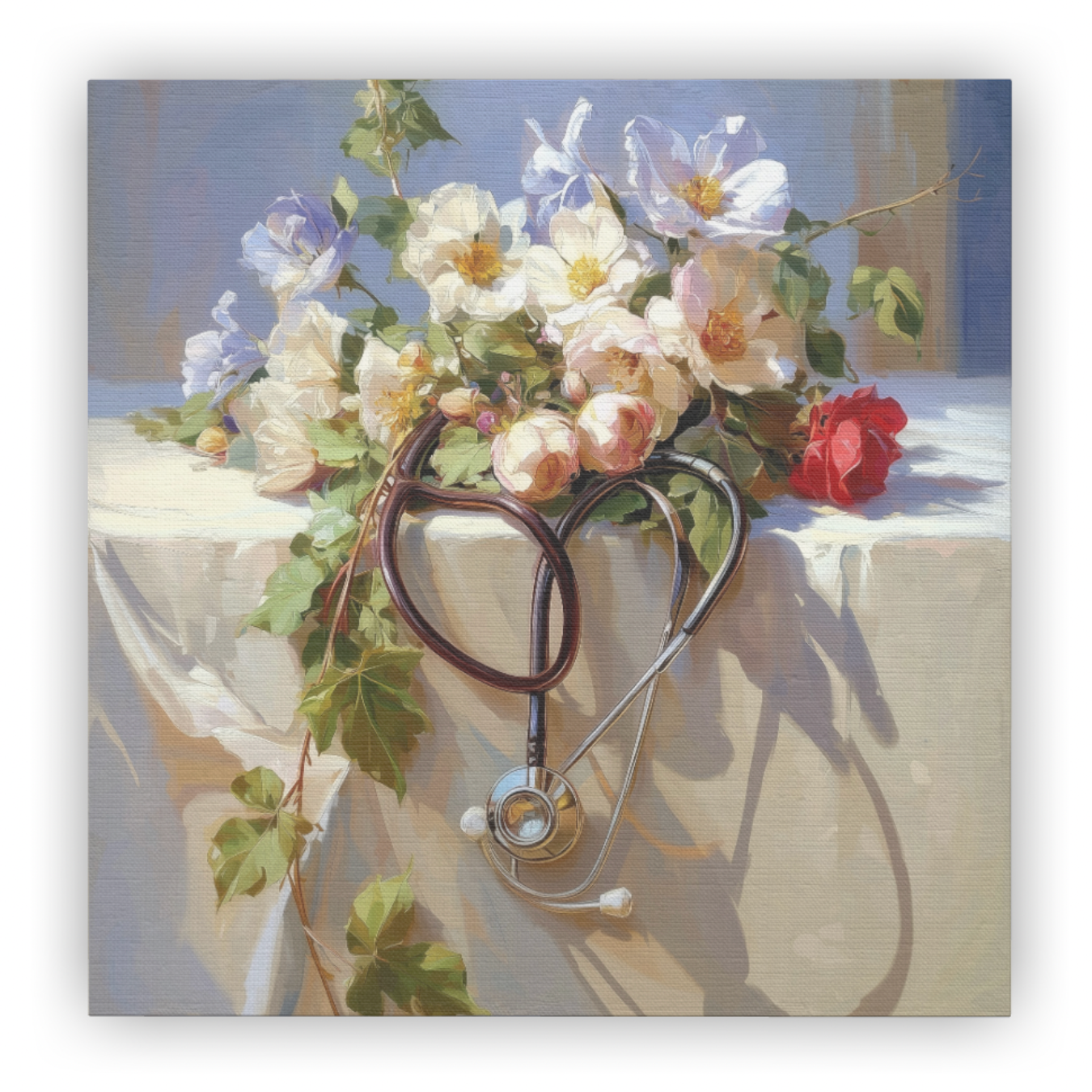 Offrez un tableau délicat et symbolique où le stéthoscope devient l’écho d’un cœur en fleurs.
