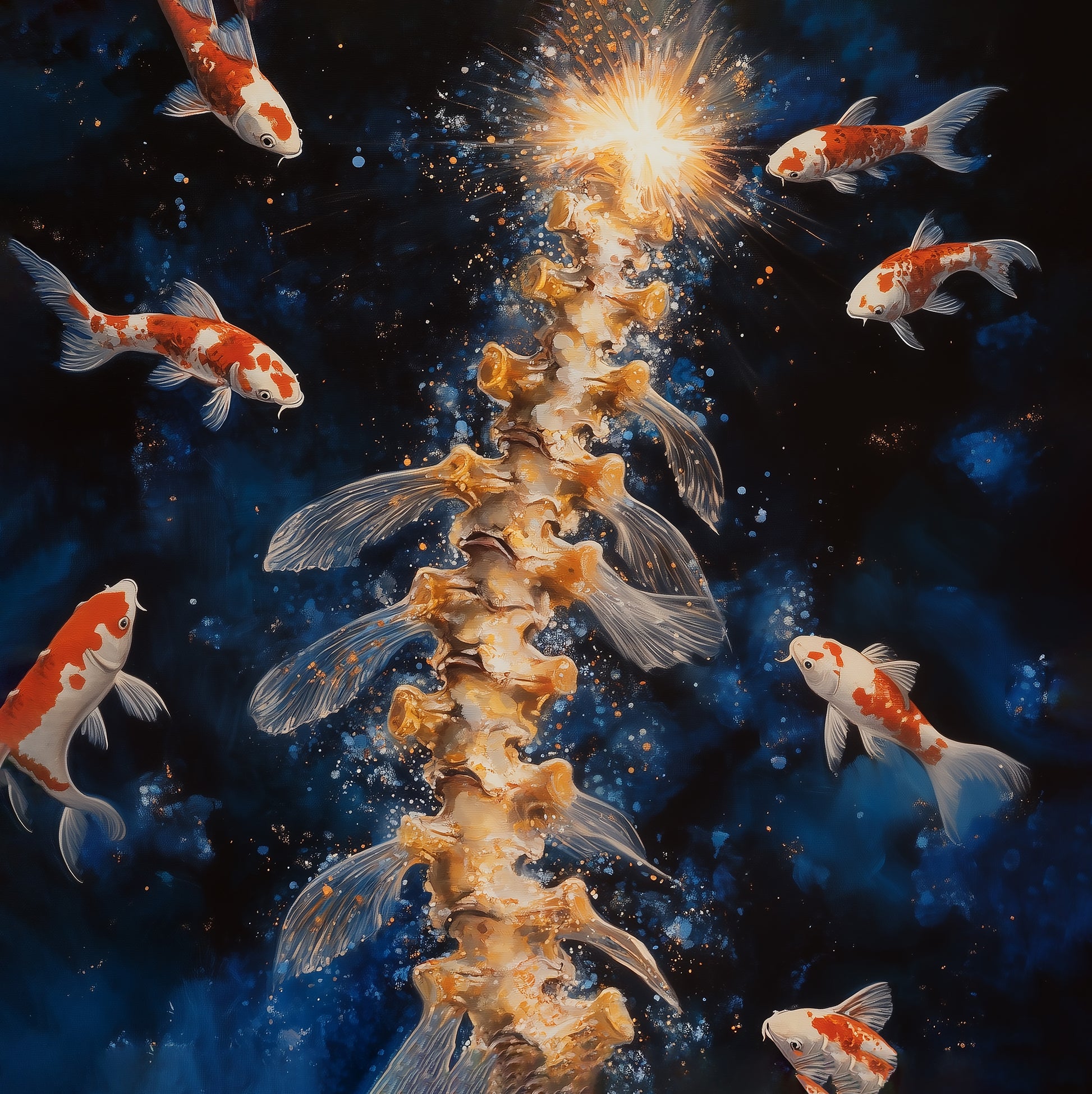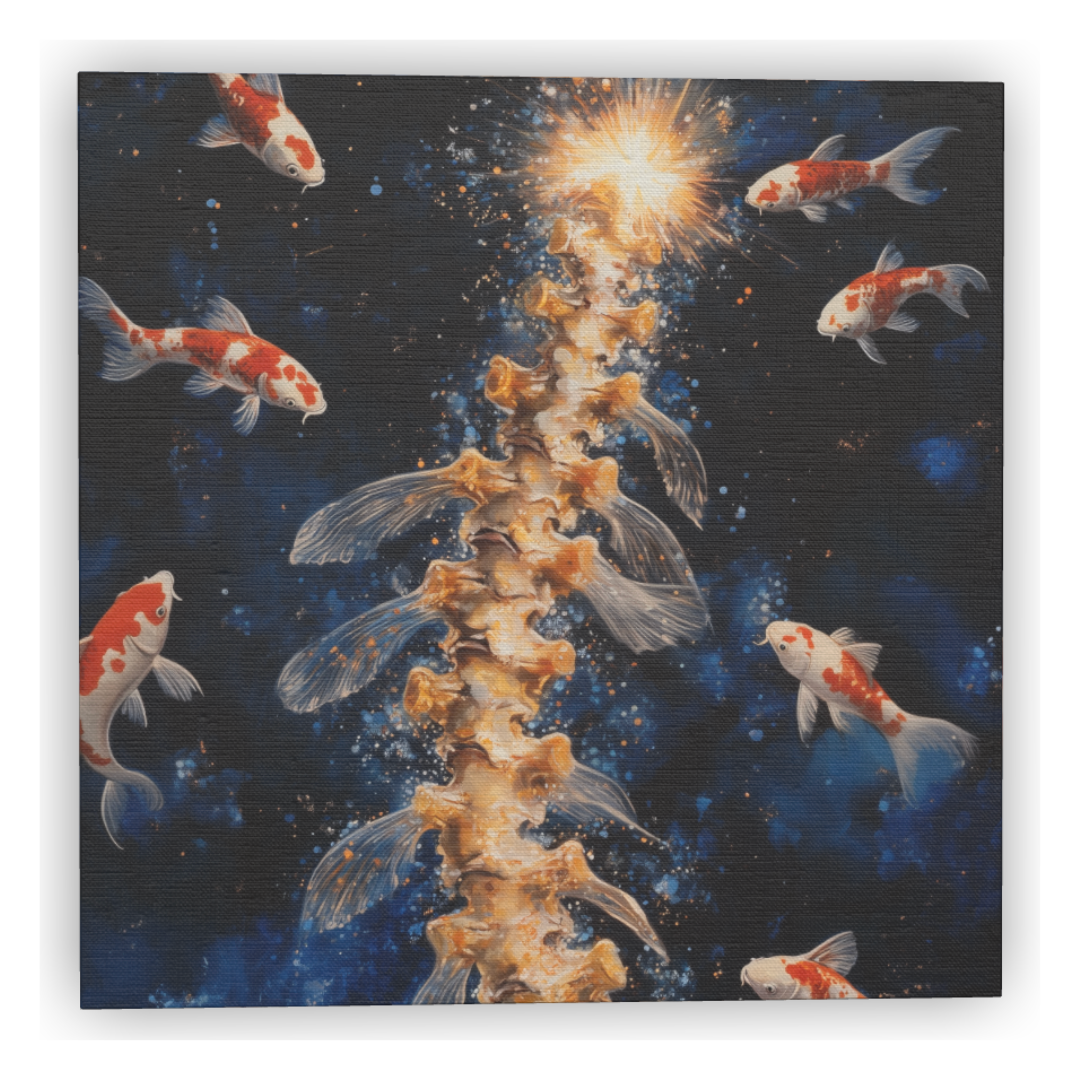 Dans un futur lointain, un archéologue tombe sur une scène étrange et mystique : une colonne vertébrale humaine flottant dans un environnement aquatique, entourée de carpes koï aux mouvements gracieux. Ces poissons semblent garder un secret génétique ancien, un mystère encore non élucidé.