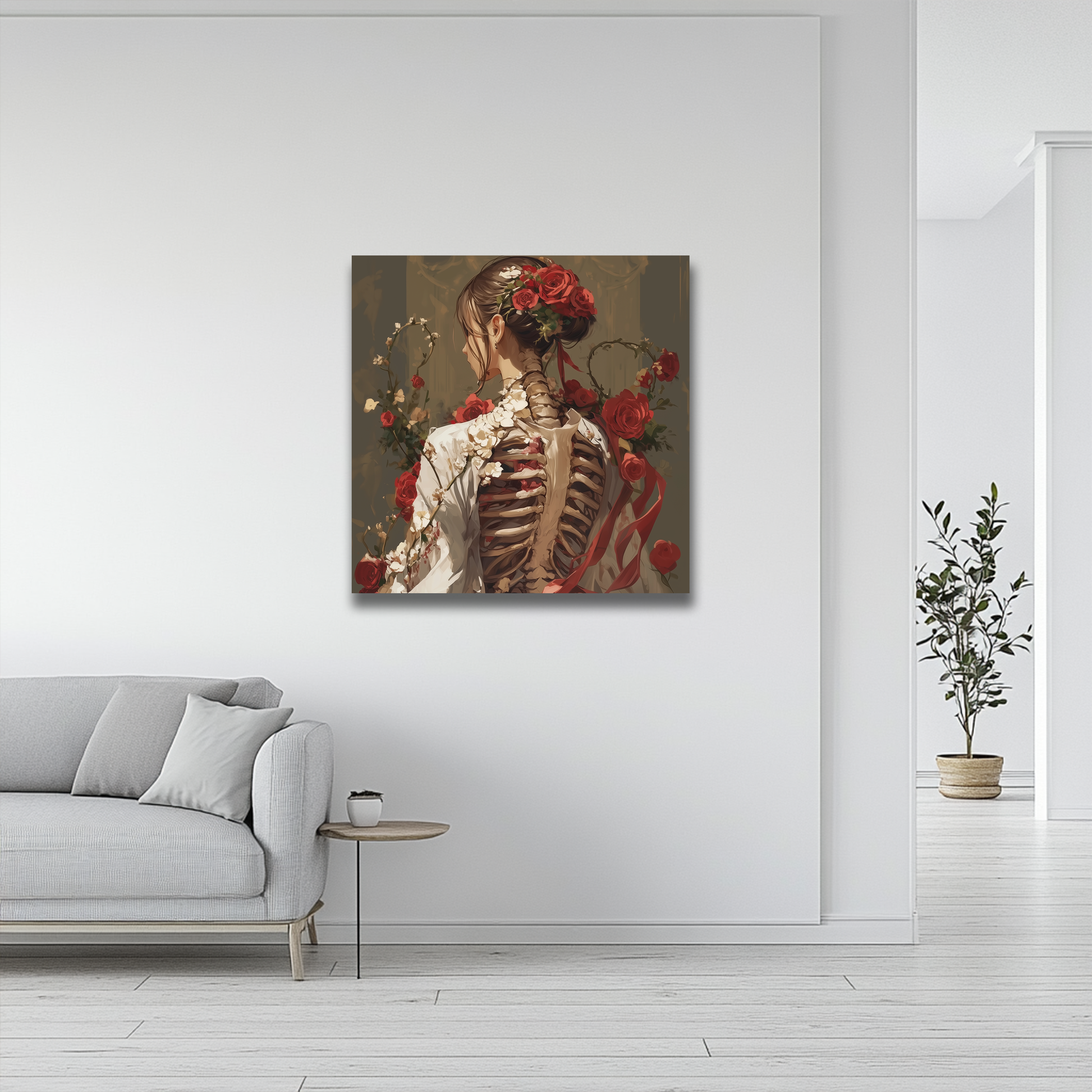 Une femme, entre vie et dépouillement, où l’éphémère beauté de la chair s’efface pour laisser place à l’intemporelle structure de l’être. Les fleurs s’enlacent aux os comme le temps aux souvenirs, rappelant que l’existence est un équilibre fragile entre ce qui se fane et ce qui demeure. Un hommage à la résilience 🎨