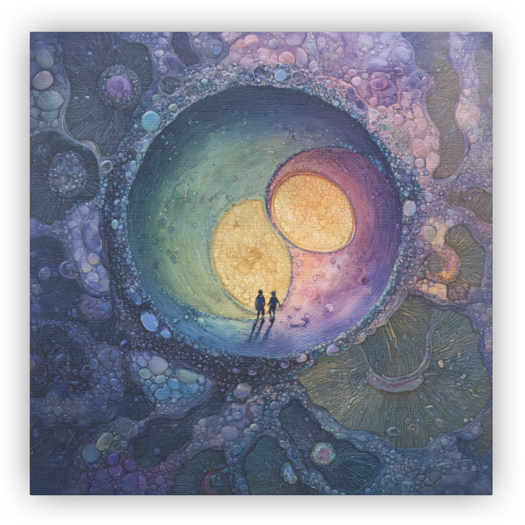 Dans Séparation Cellulaire, une cellule se divise… mais en son cœur, deux silhouettes humaines cherchent encore à se rejoindre.