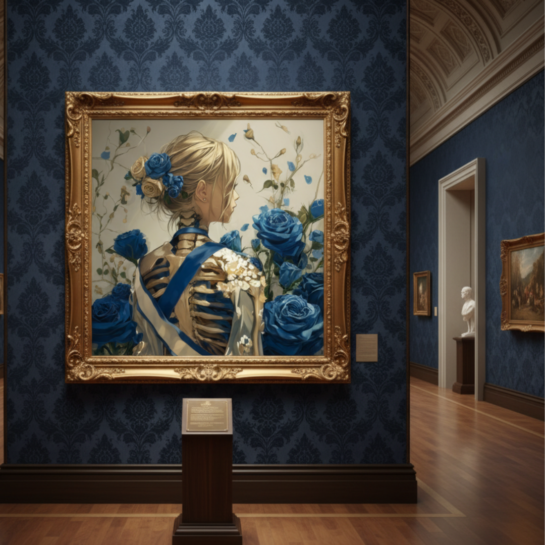 Autour d’elle, des roses bleues s’épanouissent, symboles d’une beauté rare et fragile. Le mur fissuré derrière elle reflète nos propres brisures, ces fragilités invisibles que chacun porte en silence.